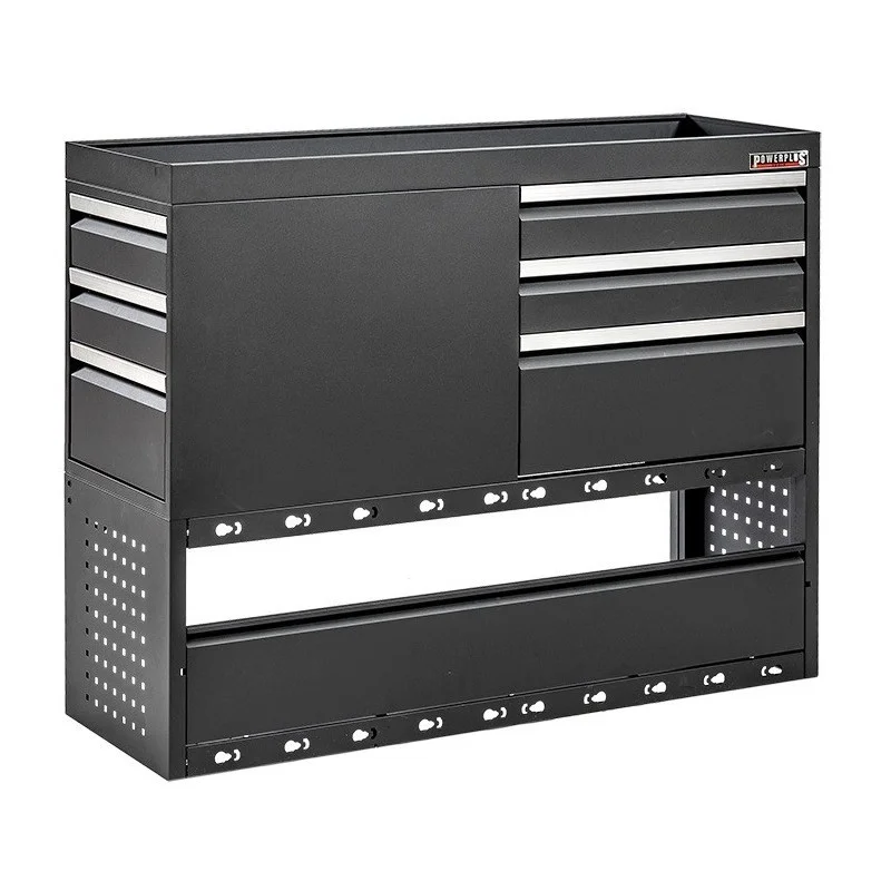 Universele plaatstalen kast met 6 lades en open vakken voor inbouw in bedrijfswagen. Deze representatieve antraciet / matzwart gecoate inbouwkast wordt compleet gemonteerd geleverd en past in vrijwel alle bestelwagens in de lengtes L2, L3 en L4. Heeft u een L1 voertuig kom dan geheel vrijblijvend langs om te checken of één van de Powerplustools inbouwkasten past.