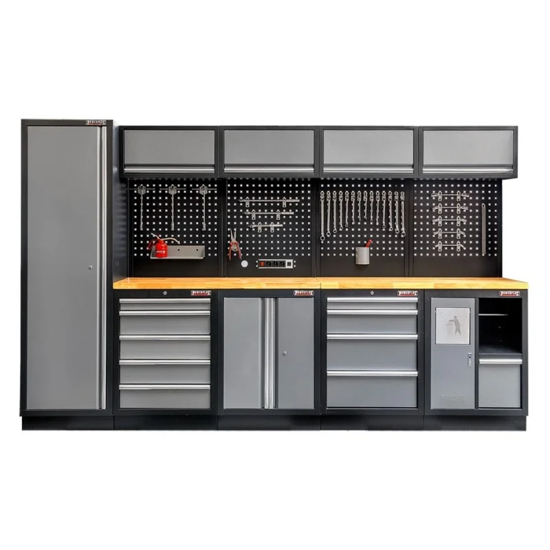 Werkbank set met hardhouten blad, gereedschapskast, gereedschapsbord matzwart, 4 hangkasten - 9 laden - 332 x 200 cm