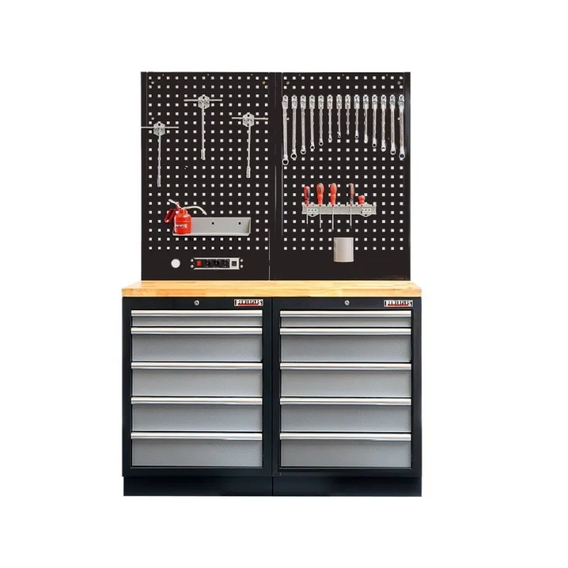 Werkbank set met hardhouten werkblad, gereedschapsbord matzwart en 10 laden - 136 x 46 x 94,5 / 199,5 cm.