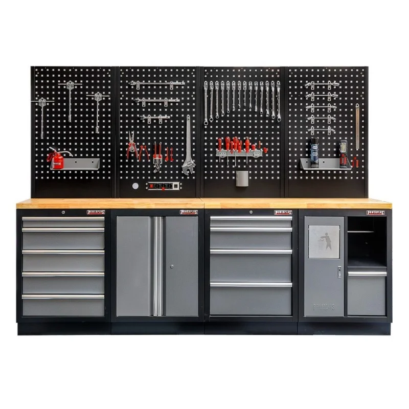 Werkbank set met hardhouten werkblad, gereedschapskast, gereedschapsbord matzwart, - 10 laden - 272 x 46 x 94,5 / 199,5 cm