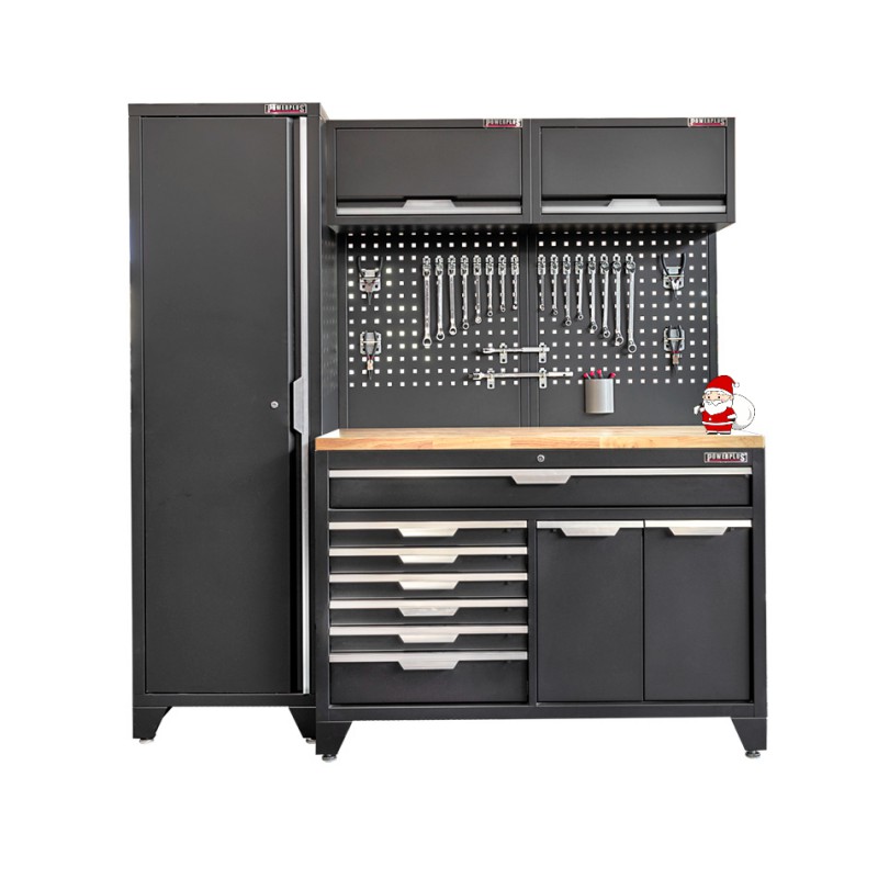 Een werkplaats wandmeubel van bijna 2 meter lang bestaande uit: 1 x werkplaatskast PP-T 2889, een hoge kast met 1 deur welke word geleverd met 4 verstelbare pootjes in het basisframe waarmee oneffenheden in de vloer kunnen worden opgevangen
