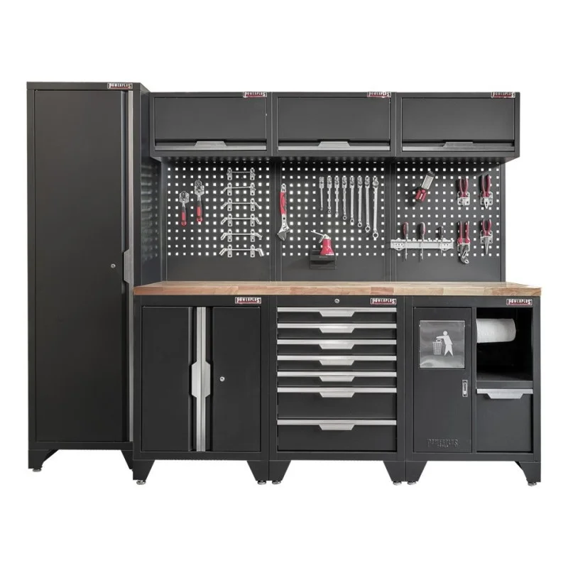 Gereedschapskasten set wandlengte 264 cm. tweedeurs lage kast, ladenblok, afvalbak, hoge kast, matzwart