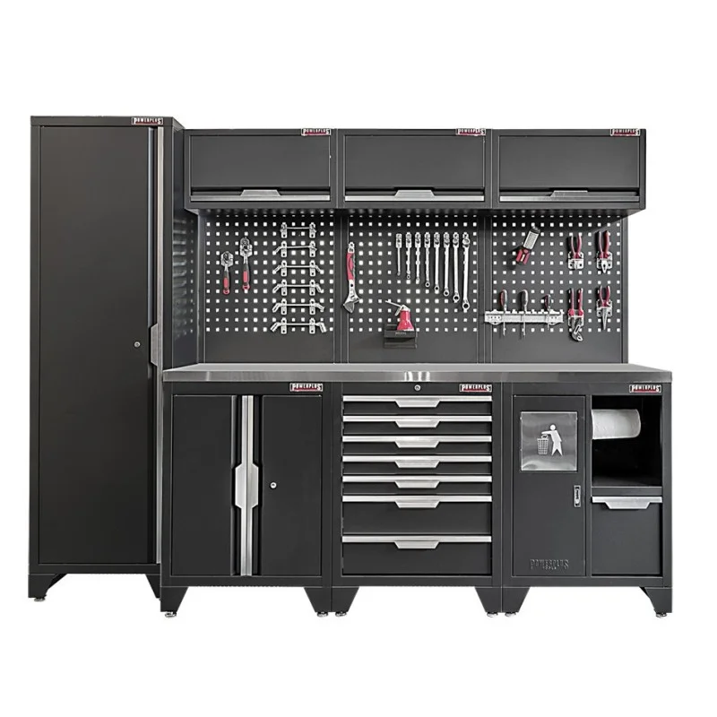 Deze set bestaat uit 1 x werkplaatskast PP-T 2885 met 2 deuren, een mooie tweedeurs kast voor het opbergen van grotere producten. Deze gereedschapskast wordt standaard geleverd met 4 verstelbare pootjes in het basisframe waarmee oneffenheden in de vloer kunnen worden opgevangen.