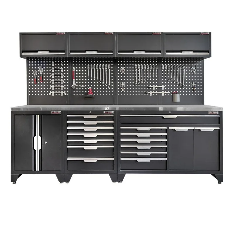 Gereedschapskasten set wandlengte 272 cm. tweedeurs kast, metaal omkleed werkblad, ladenblok, hangkast, matzwart.