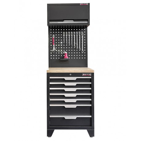Deze set bestaat uit 1 x PP-T 2884, een degelijke werkplaatskast met 7 laden, de meest populaire uitvoering met 5 ondiepe en 2 diepe laden. Deze gereedschapskast wordt standaard geleverd met 4 verstelbare pootjes in het basisframe waarmee oneffenheden in de vloer kunnen worden opgevangen.