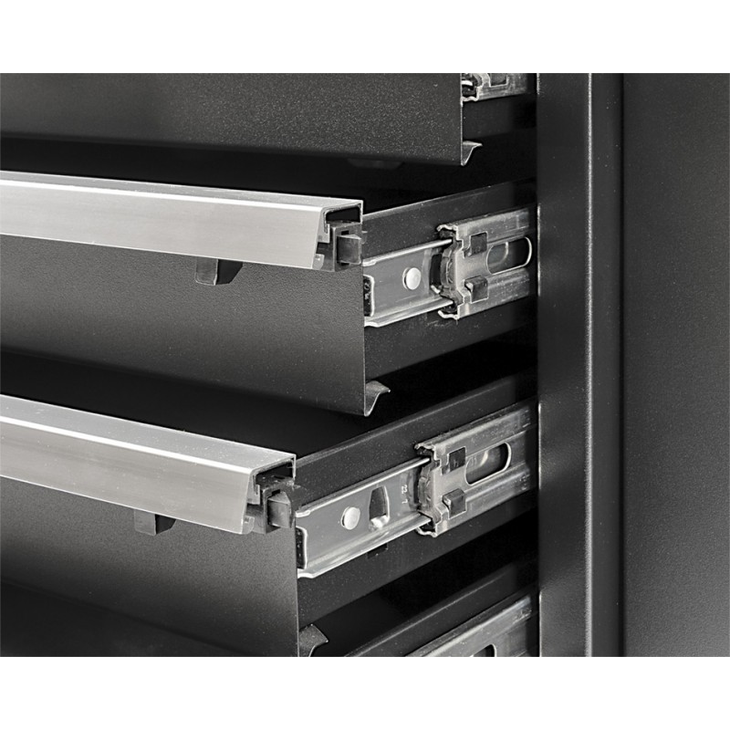 Alle laden zijn uitgerust met geleidingen met kogellagers, in iedere lade ligt een dunne, zachte mat en de lades zijn centraal af te sluiten met een sleutel.