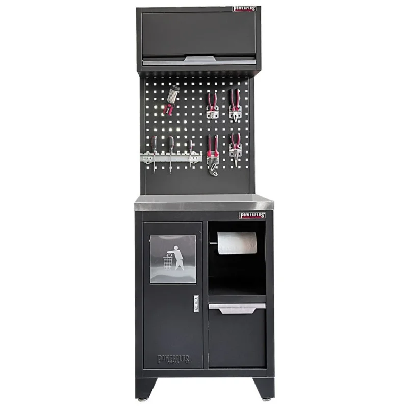 Gereedschapskasten set wandlengte 68 cm. kast met afvalbak, metaal omkleed werkblad, hangkast, gereedschapsbord matzwart