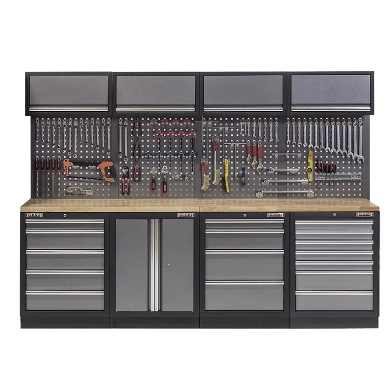 Werkbank set met hardhouten werkblad, gereedschapskast, gereedschapsbord, bovenkasten - 17 laden - 272 x 46 x 94,5 / 199,5 cm