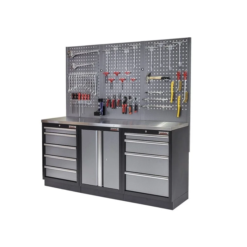 Werkbank set met MDF werkblad met RVS plaat omkleed, werkplaatsinrichting, gereedschapsbord en 9 laden - 204 x 46 x 94,6 cm