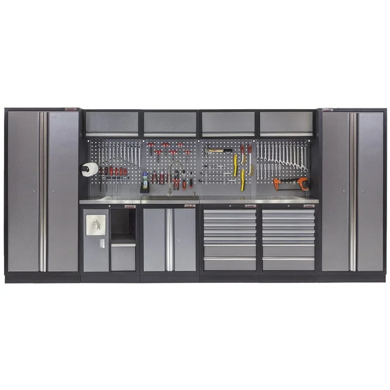 Werkbankset - met RVS plaat omkleed werkblad, werkplaatsinrichting, gereedschapsbord, hangkasten en 15 laden - 455 x 46 x 200 cm