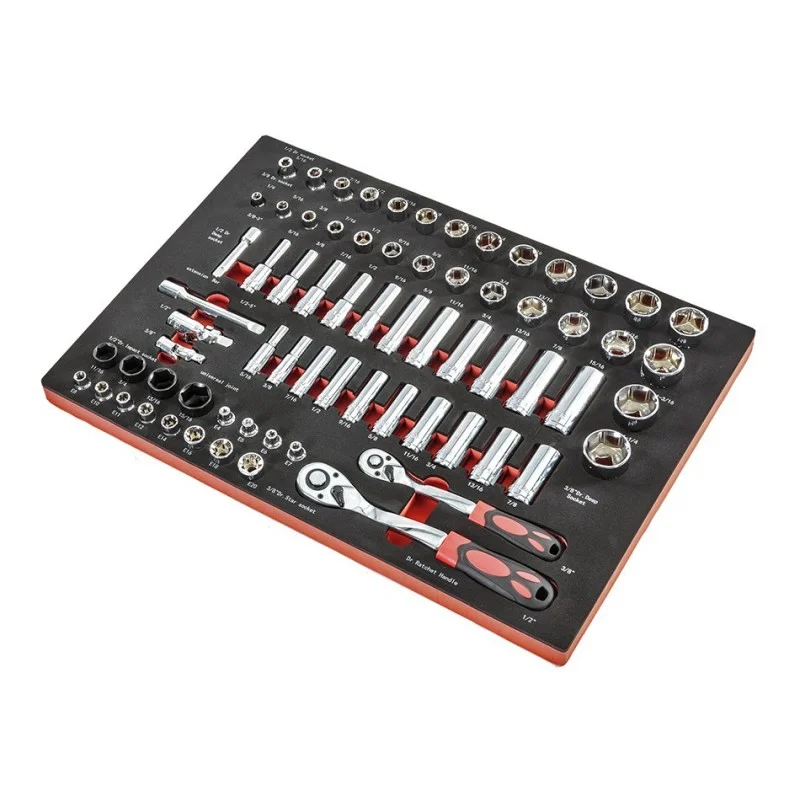 Materiaal: gereedschappen en hulpstukken Chrome Vanadium, krachtdoppen van gehard gereedschapstaal, Chrome Vanadium ratels met rubberen handvaten.