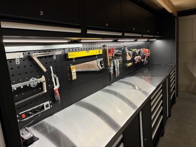Voorheen lagen zijn gereedschappen verspreid door de ruimte. En een overvolle kast maakte het zoeken naar materialen vervelend en tijdrovend. Maar daar kwam verandering in! In de afgelopen maanden maakte Jos de werkplaats compleet met de werkplaatsinrichting Heavy Duty van Powerplustools.