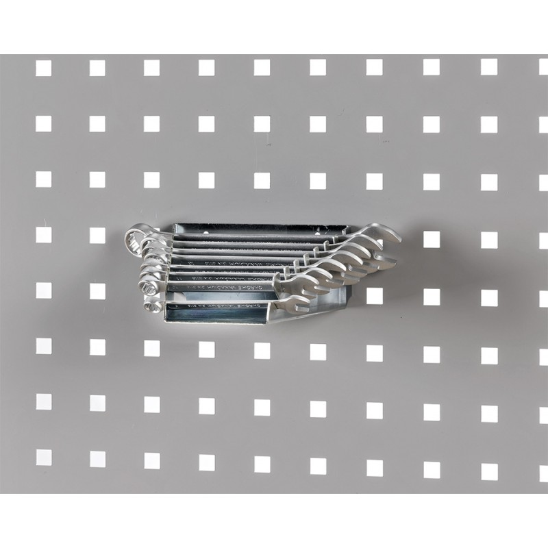 Deze gereedschapshouder is geschikt voor gereedschapsborden met vierkante gaten van 12 x 12 mm. Steek van de gaten: 45 mm. ( hart op hart )