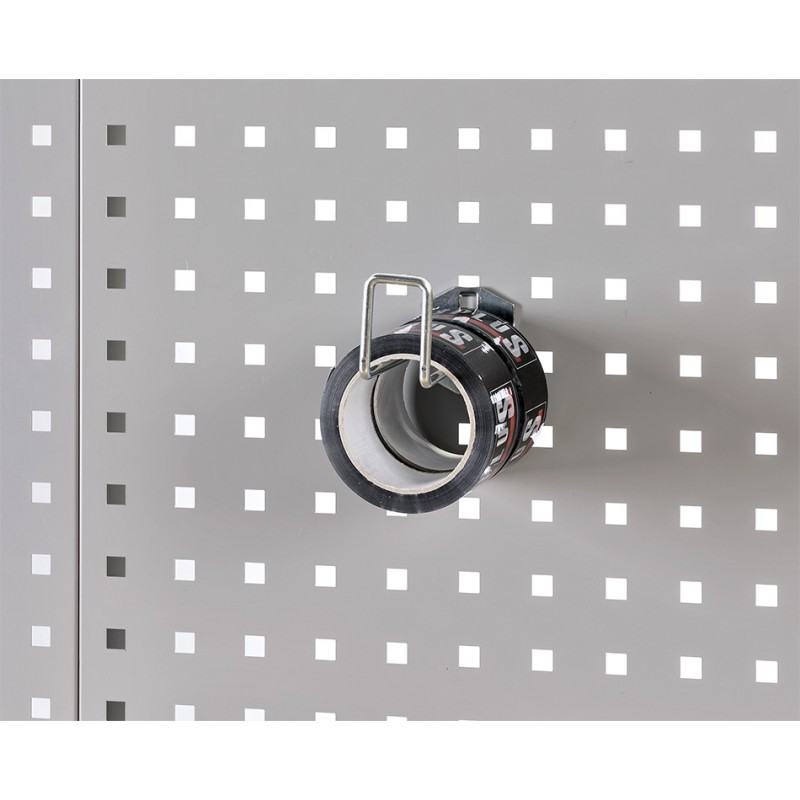 Gereedschapshaak Ø 60 mm. (binnenmaat) voor ophangen boormachine aan gereedschapsbord met 12*12 vierkante gaten Materiaal dikte Ø 6 mm. Materiaal verzinkt staal N.W. 95 gr.