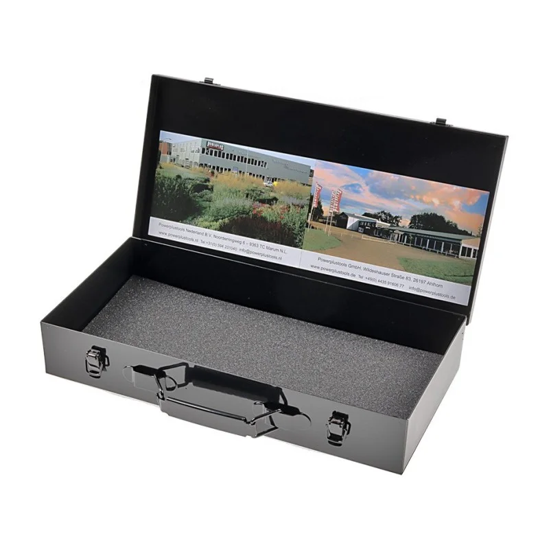 Zwart gelakte metalen koffer met handvat waarin een 1/3 la Powerplustools gereedschapsmodule van 39 x 18,5 x 3 cm. past.