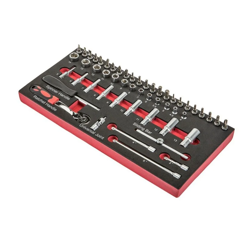 Alles overzichtelijk verpakt in soft foam module van 39 x 18,5 x 3 cm. (1/3 lade).