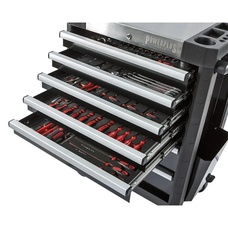 Een professionele gereedschapswagen met daarin 159 gereedschappen met levenslange garantie in overzichtelijke module. De gereedschappen zijn gemaakt van Chrome Vanadium met evt. een breukbestendig kunststof handvat, de modules met maatgegevens van het desbetreffende gereedschap er op geprint zijn gemaakt van Ethyleen Vinyl Avetaat ( EVA foam mat ) dit is een zacht, flexibel, taai, UV- en weerbestendig, lichtgewicht en slijtvast materiaal en speciaal ontwikkeld voor dit doel. Voordeel van EVA foam is dat zowel de buitenkant als de binnenkant van het zelfde materiaal is gemaakt, als het materiaal evt. zou scheuren neemt ook de binnenkant geen vocht op.