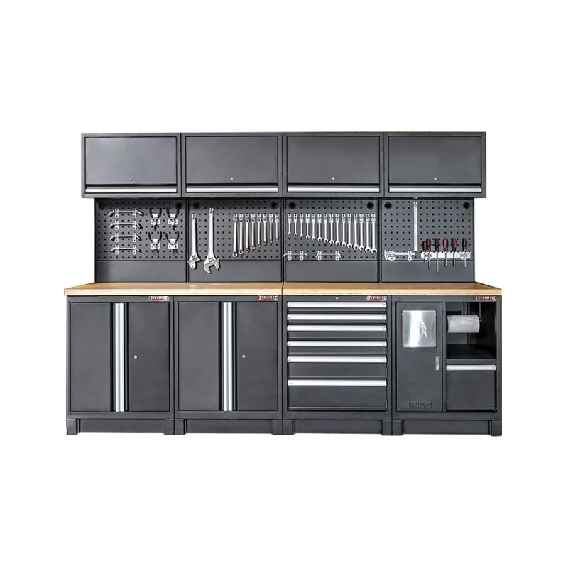 Complete werkplaatsinrichting mat zwart, werkbank + hardhouten blad, gereedschapskast, 6 laden, 288 x 200 cm