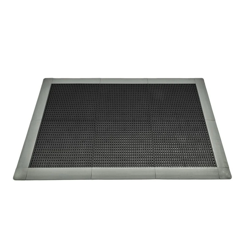 Dit type mat is ook geschikt voor gebruik in natte ruimtes en is leverbaar in de kleuren zwart en grijs. De bijpassende oprijranden en hoekstukjes leveren we in de kleuren zwart, grijs, geel en rood.
