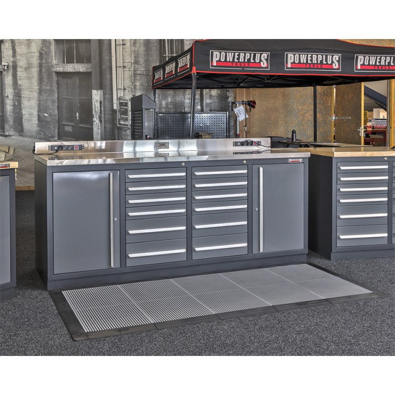 Deze werkbankmat met de afmetingen 216 x 96 cm. bestaat uit 10 zwarte kliktegels 40 x 40 x 1,2 cm., 7 grijze oprijranden mnl. en 7 grijze oprijranden vrl. plus 4 grijze hoekstukken. Eenvoudig te leggen en gemakkelijk op te ruimen.