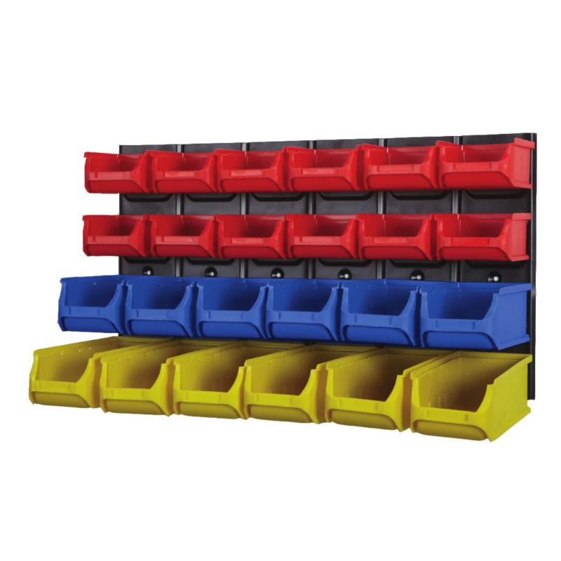 Set van 24 kunststof magazijnbakjes met metalen wandhouder, multifunctioneel opbergsysteem met kunststof magazijnbakken.
