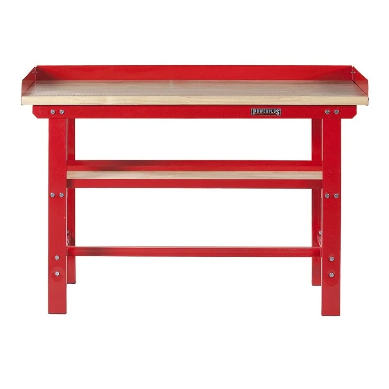Topkwaliteit werkbank van Powerplustools met oerdegelijk ijzeren frame en poten van dikwandig kokerprofiel (80 x 40 mm.) Deze professionele zware werkbank wordt geleverd inclusief een glad gelakt vingerlas verlijmd hardhouten blad van 3,6 cm. dik. Een ideale stalen werkbank voor school, autogarage, werkplaats, particulier. Deze industrieel inzetbare werkbank is verkrijgbaar in de kleuren rood en zwart. De hoogwaardige poedercoating is UV bestendig en het frame wordt samen geschroefd met gegalvaniseerde bouten en moeren (boutkwaliteit 4.8 )
