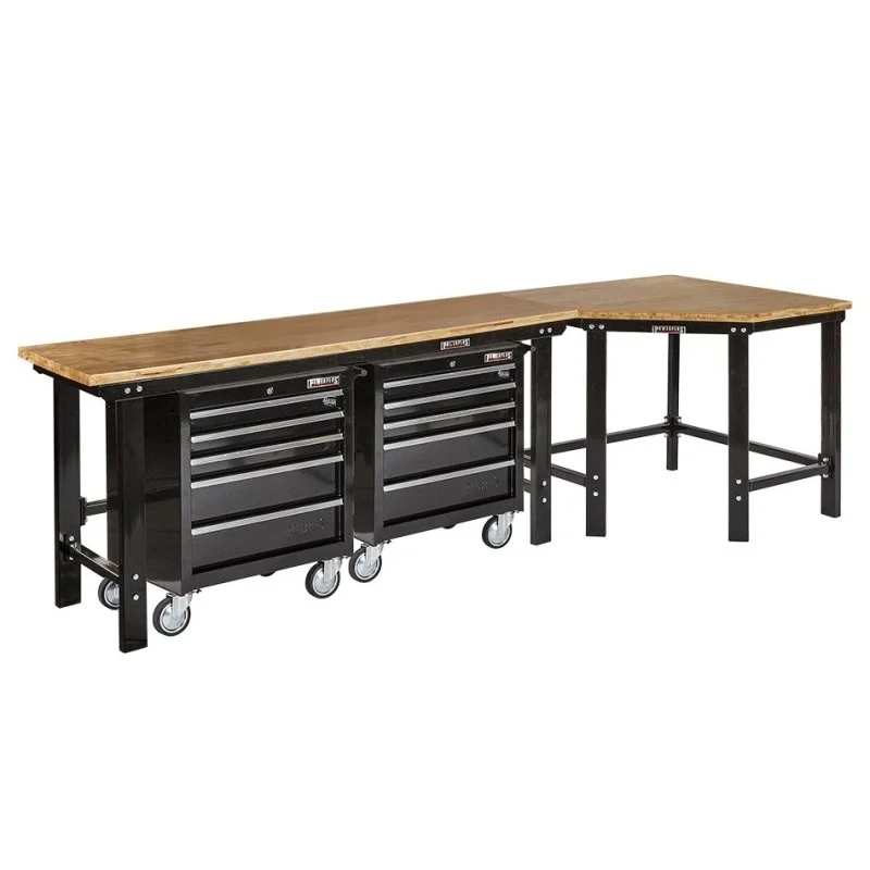 Werkbank hoekopstelling - Hoek werkbank 310 cm lang zwart met hardhouten blad en 2 gereedschapswagens