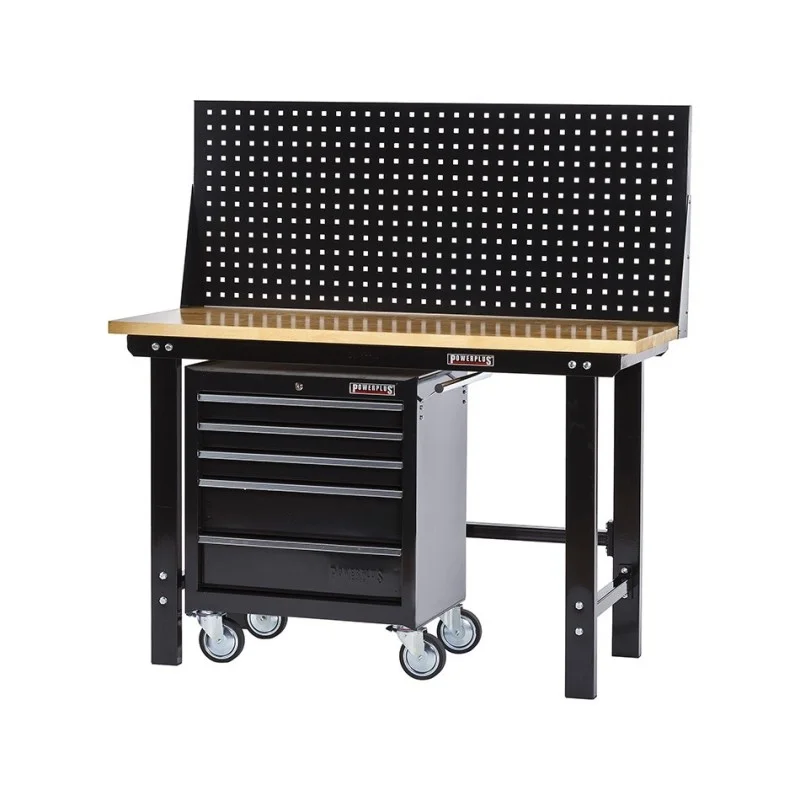 Werkbank zwart 150 cm met hardhouten blad + gereedschapswagen en zwart gereedschapsbord
