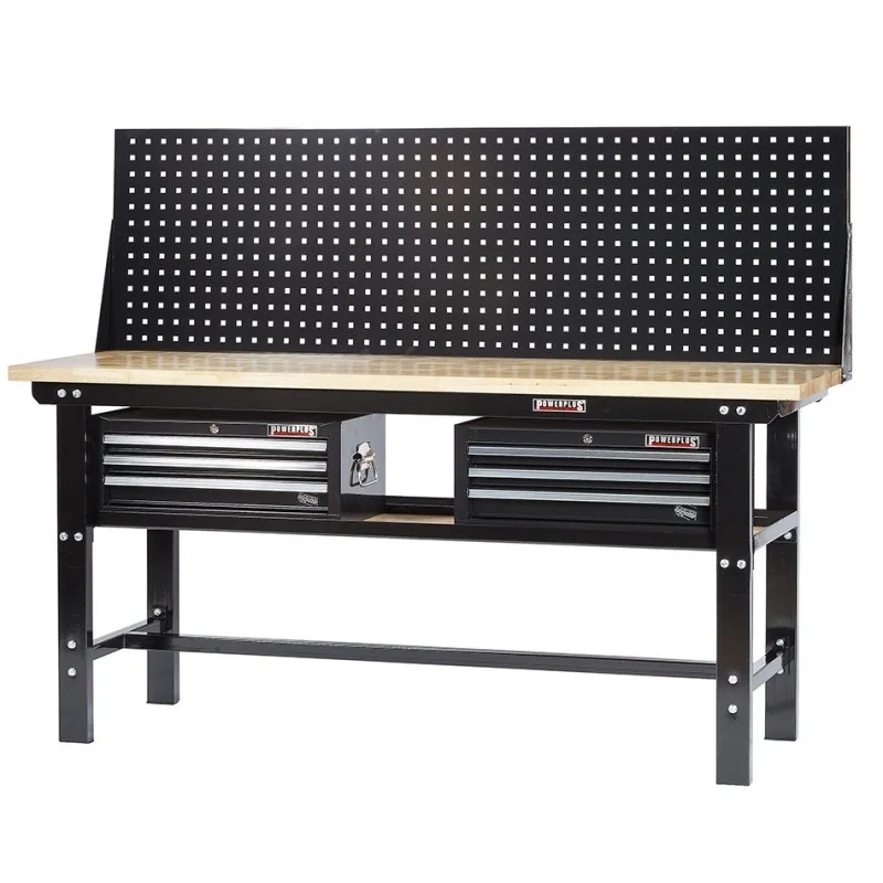 Topkwaliteit werkbank van Powerplustools met oerdegelijk ijzeren frame en poten van dikwandig kokerprofiel (80 x 40 mm.) Deze professionele zware werkbank wordt geleverd inclusief een glad gelakt vingerlas verlijmd hardhouten blad van 3,6 cm. dik. Een ideale stalen werkbank voor school, autogarage, werkplaats, particulier. Deze industrieel inzetbare werkbank is verkrijgbaar in de kleuren rood en zwart. De hoogwaardige poedercoating is UV bestendig en het frame wordt samen geschroefd met gegalvaniseerde bouten en moeren (boutkwaliteit 4.8 )