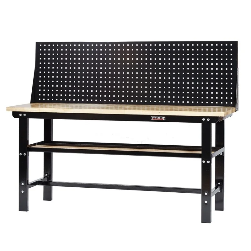 Topkwaliteit werkbank van Powerplustools met oerdegelijk ijzeren frame en poten van dikwandig kokerprofiel (80 x 40 mm.) Deze professionele zware werkbank wordt geleverd inclusief een glad gelakt vingerlas verlijmd hardhouten blad van 3,6 cm. dik. Een ideale stalen werkbank voor school, autogarage, werkplaats, particulier. Deze industrieel inzetbare werkbank is verkrijgbaar in de kleuren rood en zwart. De hoogwaardige poedercoating is UV bestendig en het frame wordt samen geschroefd met gegalvaniseerde bouten en moeren (boutkwaliteit 4.8 )