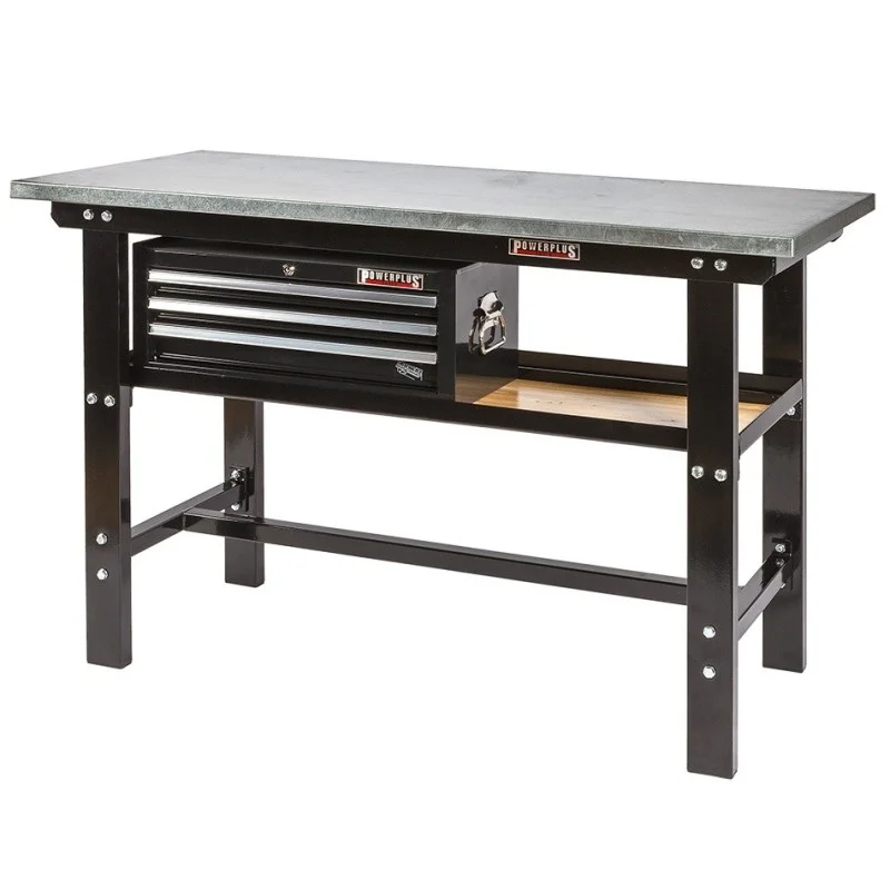 Topkwaliteit werkbank van Powerplustools met oerdegelijk ijzeren frame en poten van dikwandig kokerprofiel (80 x 40 mm.) Deze professionele zware werkbank wordt geleverd inclusief een geperst houten blad met daaromheen een metalen plaat. Een ideale stalen werkbank voor school, autogarage, werkplaats, particulier. Deze industrieel inzetbare werkbank is verkrijgbaar in de kleuren rood en zwart. De hoogwaardige poedercoating is UV bestendig en het frame wordt samen geschroefd met gegalvaniseerde bouten en moeren (boutkwaliteit 4.8 ) Advies voor montage van een bankschroef: houten blad doorboren met een Ø 6 mm. boor en bankschroef monteren met M6 bouten, aan de onderzijde grote platte ijzeren ringen of ijzeren plaat monteren en daarna stevig vastzetten met moeren.