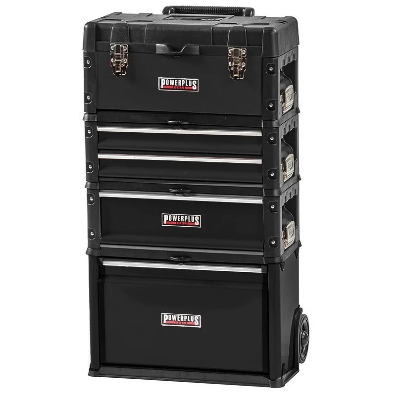 Verrijdbare gereedschapstrolley 4 delig met stapelbare gereedschapskisten.