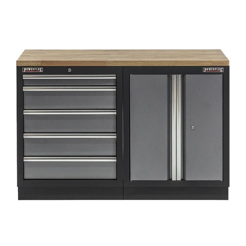 Werkbank set met hardhouten werkblad, werkplaatskast en 5 laden blok - 136 x 46 x 94,6 cm.