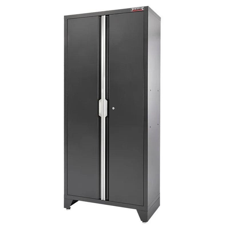 Chique matzwarte werkplaatskast met twee deuren en vier in hoogte verstelbare legborden. Deze gereedschapskast wordt standaard geleverd met 4 verstelbare pootjes in het basisframe waarmee oneffenheden in de vloer kunnen worden opgevangen.